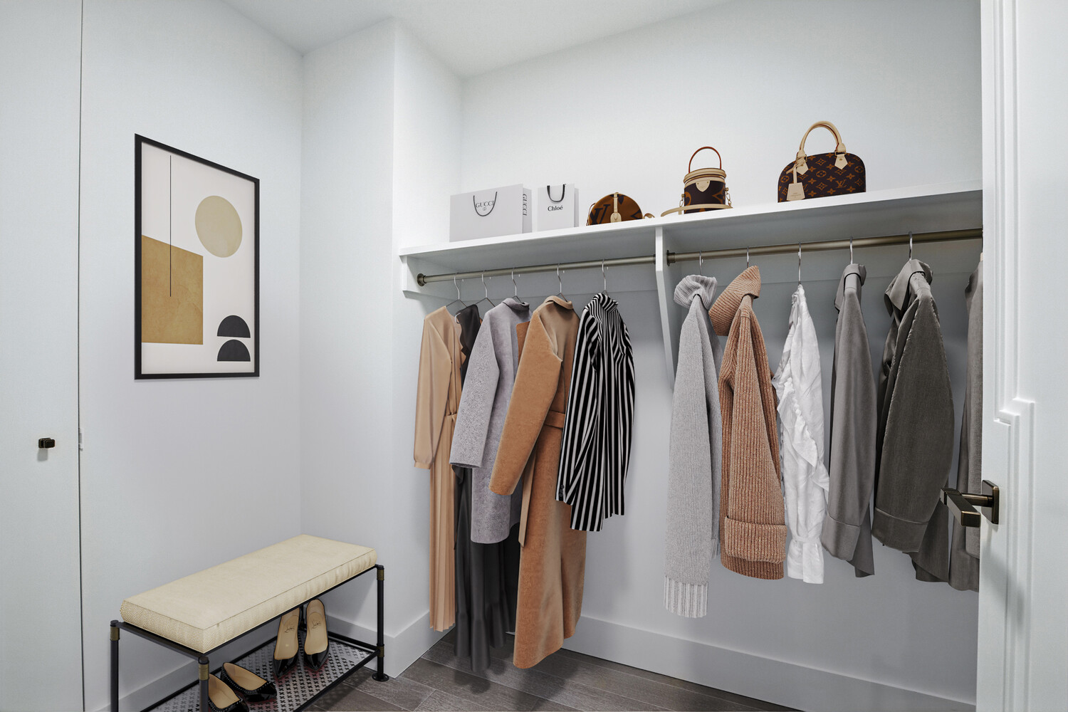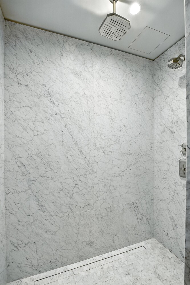 The primary suite is a tranquil retreat, featuring a walk-in closet with AV closet and an ensuite bath clad in full-slab Bianca Carrara marble with radiant heated floors, custom nickel fixtures, a vanity in Luna Gray marble, and a spacious walk-in shower.
