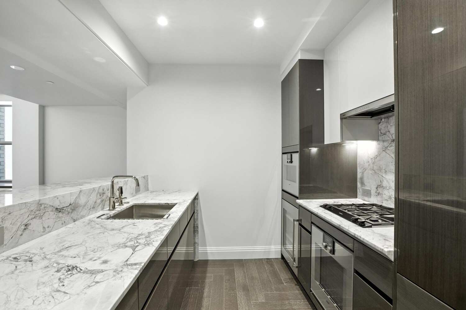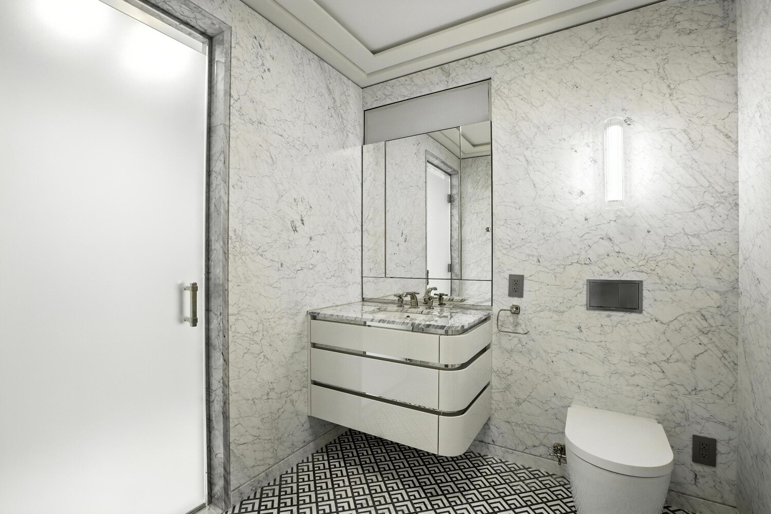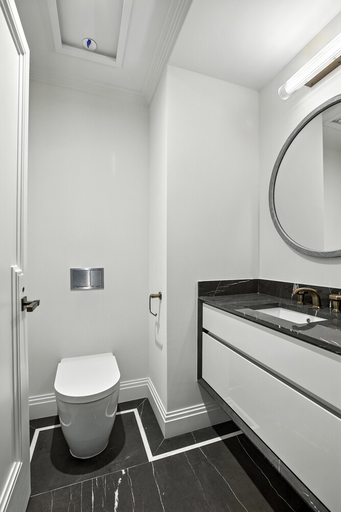 The Molteni&C chef's kitchen includes concealed Gaggenau appliances, polished Arabescato Quartzite countertops and backsplash, and custom lacquer and wood cabinetry all blend seamlessly into the architecture. There is a laundry room off the kitchen and the elegant powder room off the entry allows separation for entertaining appointed with a wall-mounted marble vanity and antique bronze fixtures.